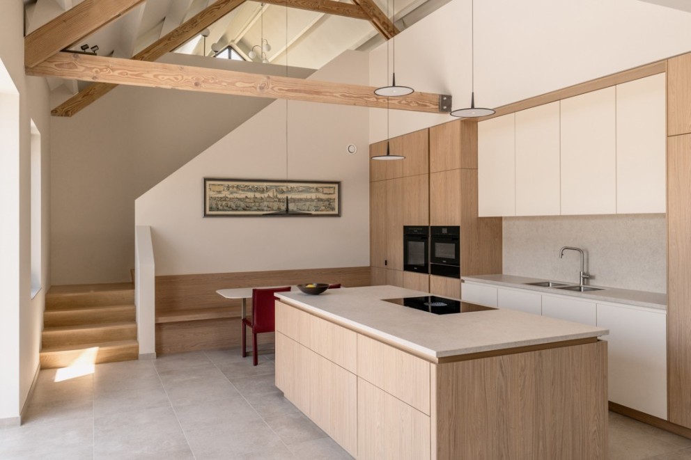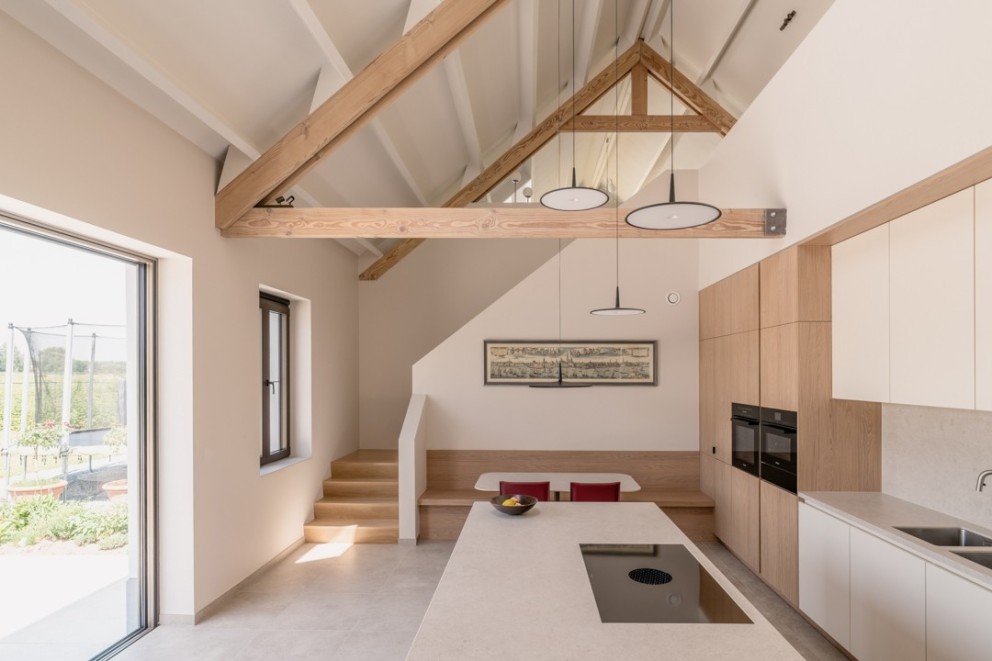 Keuken in warme tinten met aansluitend een gezellige ontbijthoek.